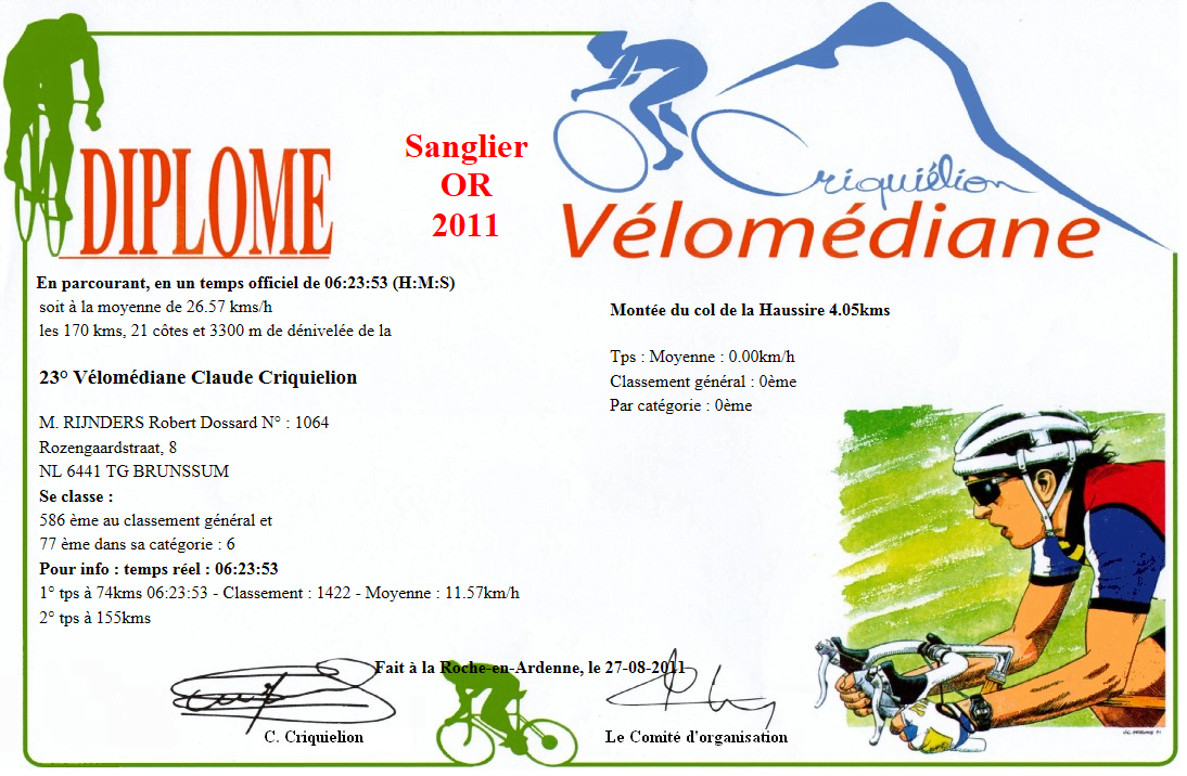 In the official Vélomédiane 2011 Classification (PDF), I finished 586th out of 1,332 total and 77th out of 248 in my category.