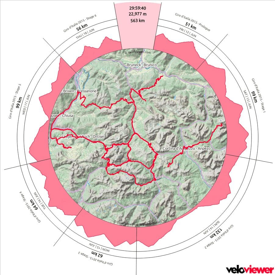 That stage also had the highest elevation gain according to Strava: 4,862 meters, including the Würzjoch and the 30+ kilometer ascend of the Gardena.