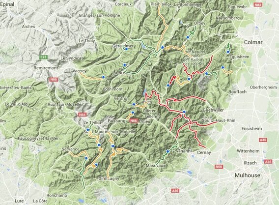 The Grand Ballon for instance, has no less than six alternatives, although there is some overlap: the climbs from Moosch and Saint Amarin join at Geishouse and the ones from Willer, Cernay, Soultz and Wattwiller join at the Col Amic, near Goldbach.