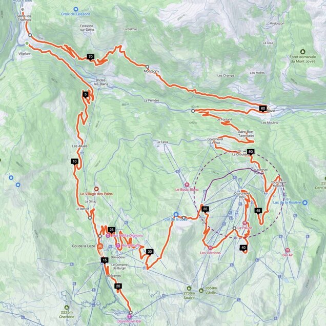 I’m not yet 100% sure of the route I will take, but my plan is to tackle Meribel (all of it) first, then travel Col de la Loze while Paula transfers by car to Courchevel, where we will reunite.
