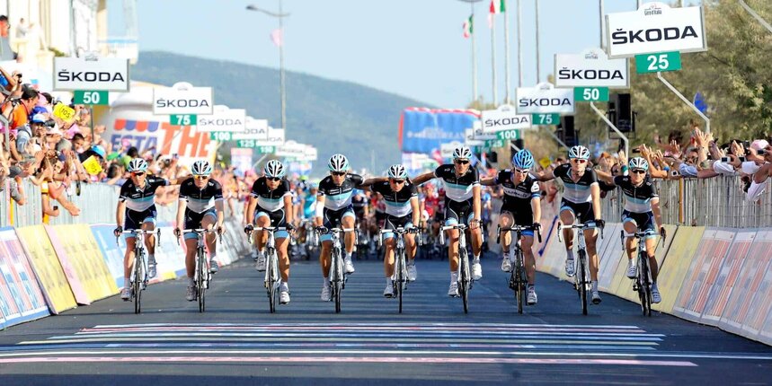 Giro d’Italia 4th stage finish. In the photo: team Leopard Trek and – 3rd from the right – Tyler Farrar, Wouter’s buddy.
